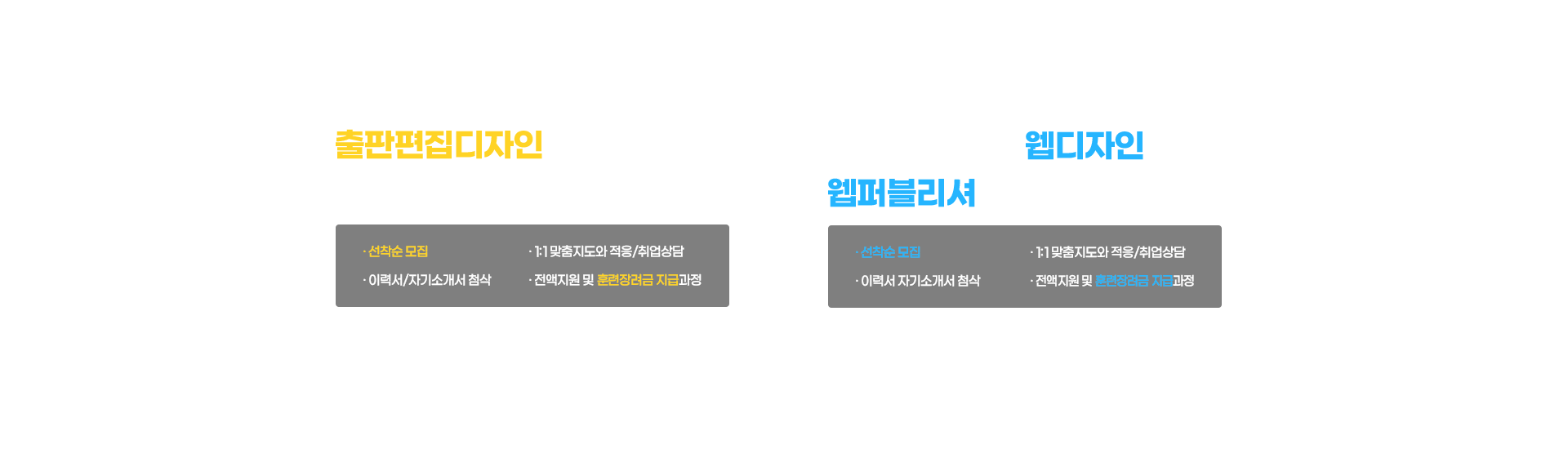 김정원, 김도경 취업생다른 교육과정 이후에 심화 과정에 대한 필요성을 인지해서 관련 교육을 찾아보다가 하이미디어의 교육과정을 확인해보니 포르폴리오 중심의 커리큘럼에서 많은 도움을 받을 수 있을것 같아 선택하게 되었습니다. -